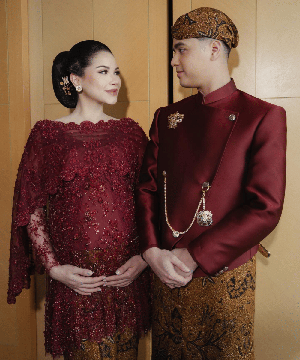 Alyssa looked utterly enchanting in a captivating maroon kebaya, adorned with intricate, light-catching sequin details. The garment’s fitted silhouette elegantly accentuated her figure, offering a sleek yet sophisticated appeal, while its modern cut on the shoulders and sleeves injected a contemporary freshness into her look. This stunning kebaya was paired with a rich golden-brown batik fabric, creating a harmonious color palette characteristic of traditional Javanese attire. The combination not only amplified the traditional elegance but also imparted a touch of undeniable luxury.