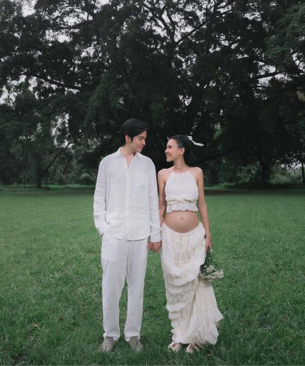 Sementara itu, Angga tampil sederhana namun tetap stylish dengan kemeja putih polos berlengan panjang dan celana longgar. Perpaduan busana serba putih ini memberikan kesan bersih, hangat, sekaligus melambangkan awal baru yang penuh harapan dalam menyambut anggota keluarga baru.