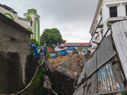 A towering 5-meter high residential wall in Kalibata, South Jakarta, dramatically collapsed onto SMPN 182, a local junior high school. The massive structure toppled towards the school grounds, completely demolishing its perimeter fence and a section of the garden.