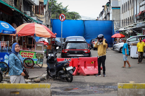 Sementara tirai biru raksasa tampak menutup sebagian Jalan Cengkeh. Penutupan berfungsi sebagai pembatas pandangan dan akses penutupan jalan.