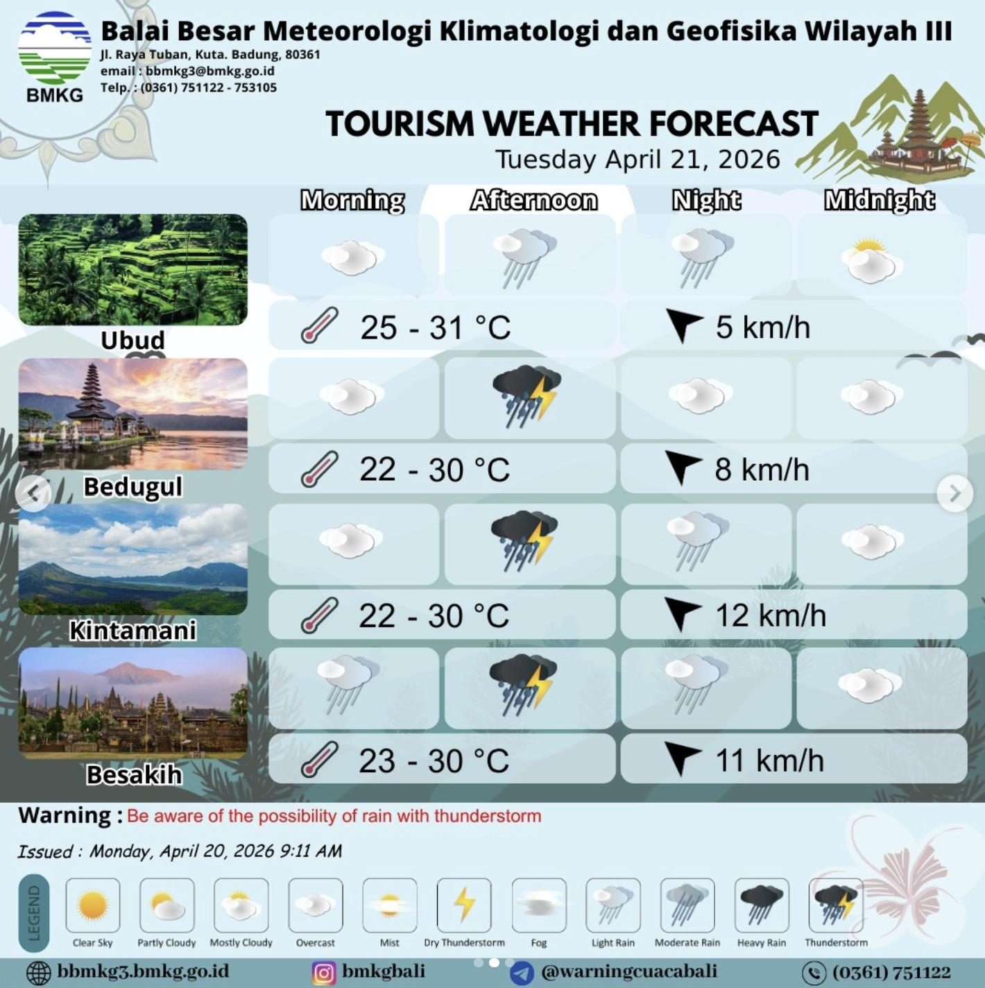 Itulah prakiraan cuaca Bali untuk Selasa 21 April 2026.