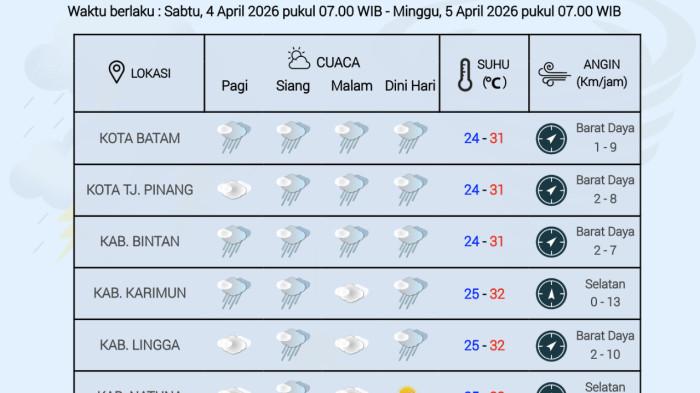 “Generally, the weather in the Riau Islands today is predicted to be cloudy with a potential for light to moderate rain in some areas, driven by local convective activity,” stated the Forecaster on Duty at BMKG Hang Nadim in their narrative weather report on Saturday, April 4.